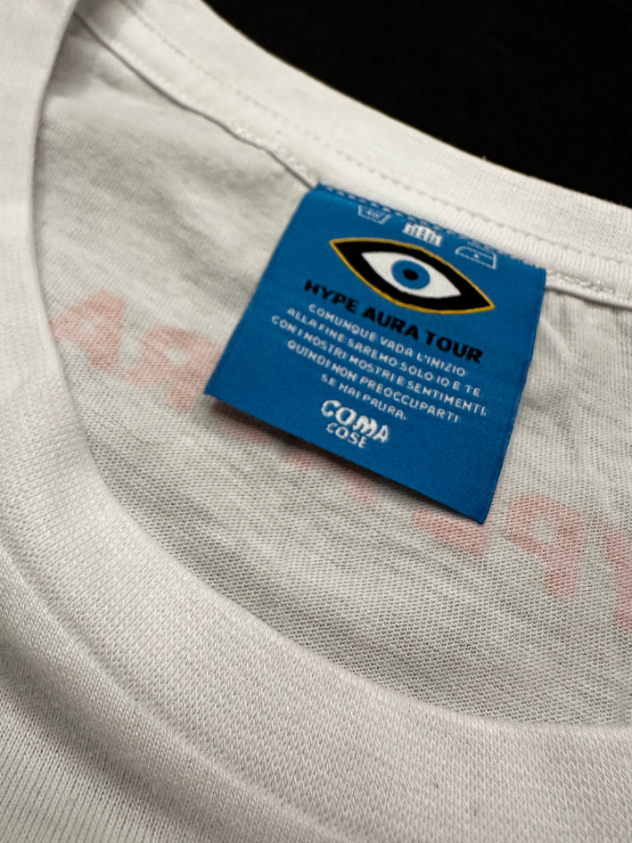 T-shirt prototipo "Coma_Cose" con etichetta personalizzata di Hype Aura