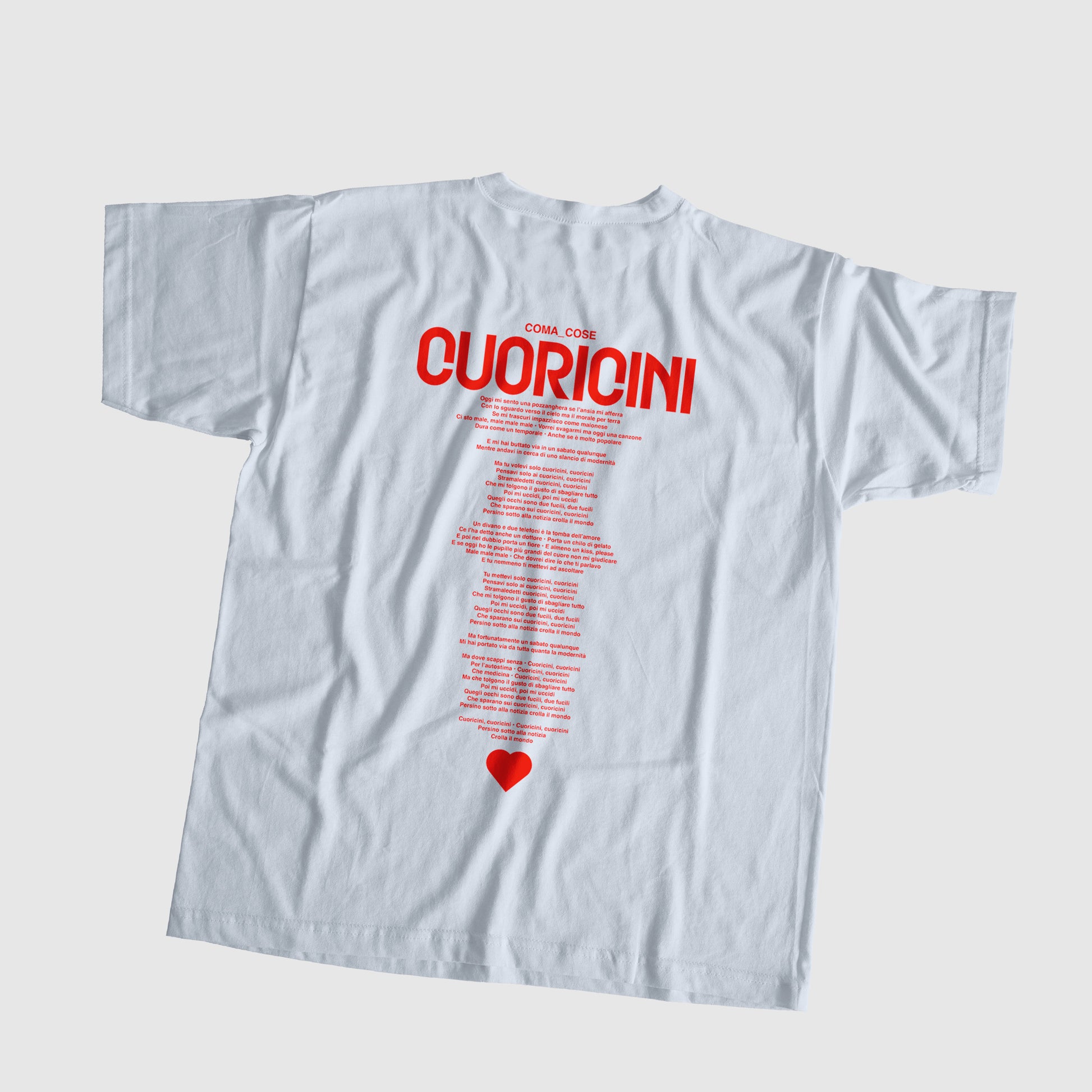 Celebra l’emozione del brano Cuoricini, con cui i Coma_Cose hanno incantato il pubblico di Sanremo 2025, con questa t-shirt iconica. Realizzata in cotone, la grafica davanti rappresenta i due cuori rossi intrecciati, e sul retro il titolo "CUORICINI" e il testo completo del brano.
