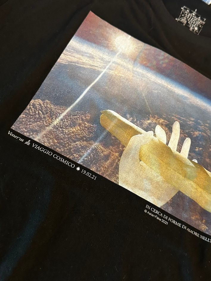 T-shirt prototipo "Viaggio Cosmico" di Venerus, datata 19.02.21, giorno di pubblicazione dell'album Magica Musica.